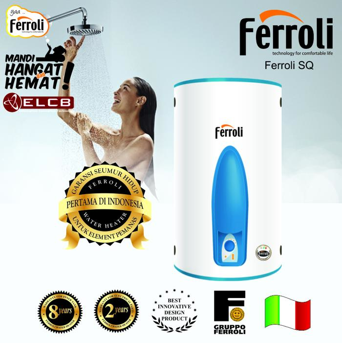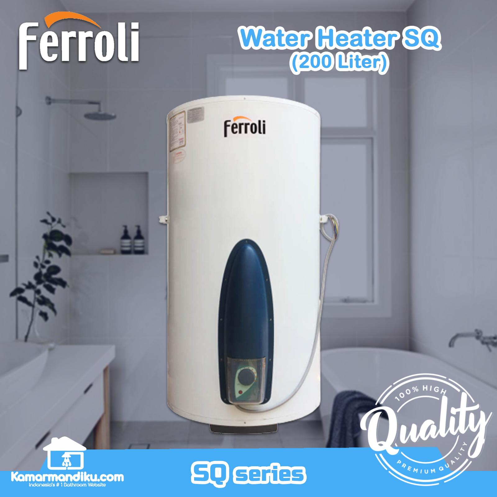 Beli dan dapatkan pemanas air Ferroli yang berkualitas dan terbaru dengan harga yang terjangkau untuk anda , pemanas air Ferroli SQ 200 Liter ini hadir melengkapi perlengkapan kamar mandi anda dengan design yang menarik dan elegan selain itu , pemanas air ferroli ini juga dilengkapi dengan beberapa fitur pilihan seperti : -Healthy Blue Silicon Glassline Titanium Enameled Coating Inner Tank Blue Silicon Titanium Glassline Proses menggunakan teknologi tinggi elektrostatis dan dipanaskan mencapai suhu 870C untuk menghasilkan tangki bagian dalam yang sangat tahan korosi, guncangan sehingga tangki menjadi tahan lama dan kualitas air selalu bersih dan sehat. -Anticalcare Heating Element Patent Technology Anticalcare Heating Element adalah elemen panas generasi terbaru dengan PLUS Technology dari Ferroli Globe R D Center di San Bonifacio Italy. Paten teknologi ini mengurangi secara signifikan terbentuknya kerak di elemen panas sehingga efisiensi pemanasan tinggi, hemat energi dan performa selalu seperti baru. -Stainless Steel Heating Element Semua elemen panas Ferroli telah menggunakan Heavy Duty Stainless Steel. -Earth Leakage Circuit Breaker (ELCB) ELCB berfungsi untuk memutuskan arus listrik jika terjadi kebocoran arus. -CFC Free Insulation Environment Friendly Polyurethane Foam High Density yang ramah lingkungan. CFC Free merupakan isolasi panas yang baik yang dapat mengurangi beban kerja elemen panas sehingga pemakaian listrik lebih irit dan efisien. -Innovation Flange System Flange System hasil penelitian Ferroli yang untuk membukanya tidak memerlukan alat khusus sehingga memudahkan perbaikan dan dapat dibersihkan. -Neoprene Gasket System Neoprene Gasket System merupakan gasket terbaik Extra Heavy Duty, tidak berbau, bersih dan sehat. Dengan gasket ini resiko kebocoran yang sering terjadi di titik tersebut dapat dikurangi sehingga water heater menjadi tahan lama. -Remote Control Wireless Dapat mengontrol