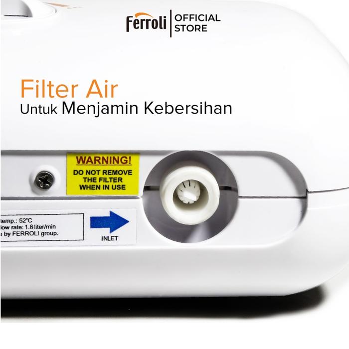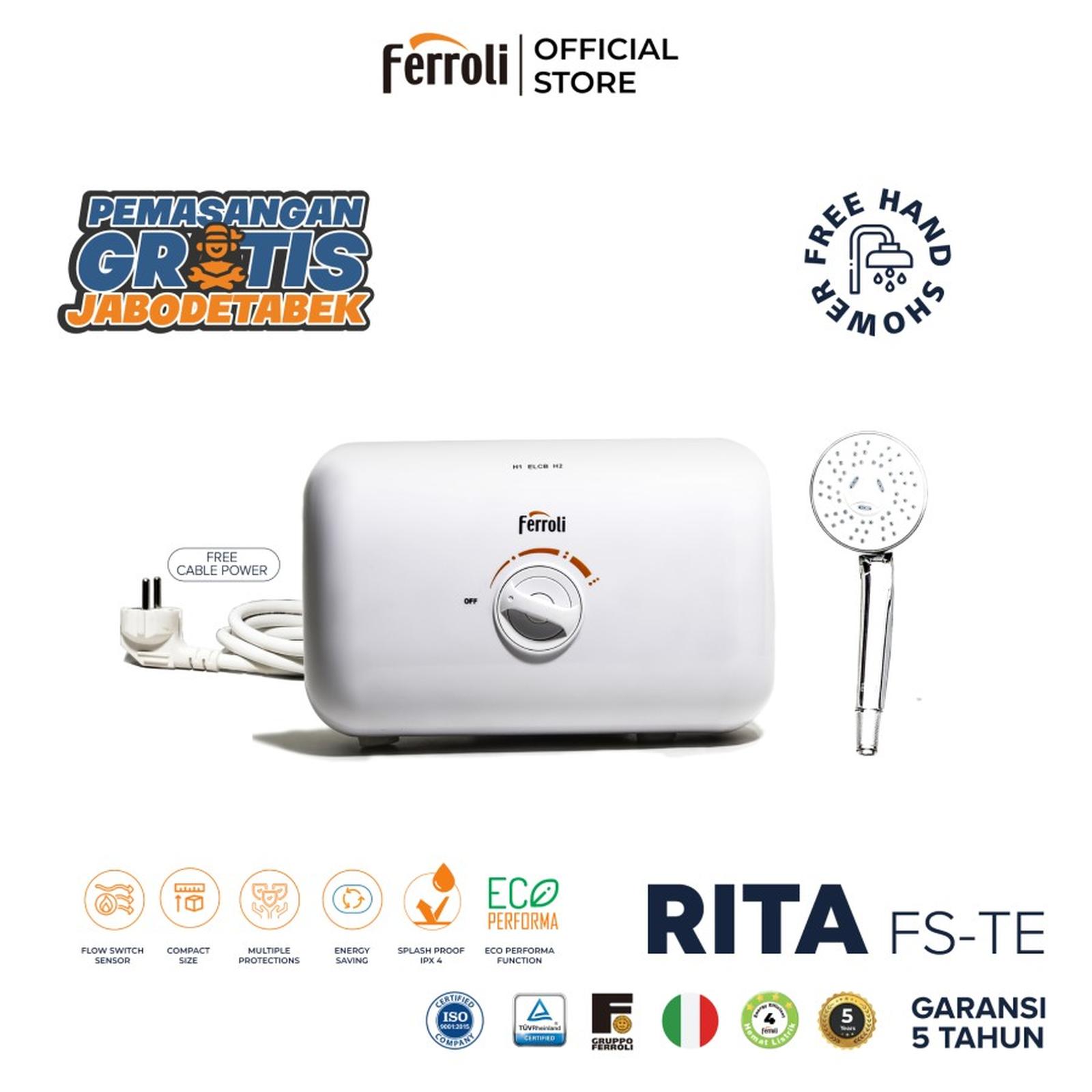 & Free ShippingFITUR amp; KEUNGGULAN FERROLI SERI RITA -Compact Size,Dapat ditempatkan di ruang yang terbatas -Menggunakan desing modern sehingga sangat cocok untuk kamar mandi tema apapun -Thermal Safety Cut-Out -Splash Proof (IPX4), 100% aman dari cipratan air. -Premium Copper Heating Element , Pemanas Air menggunakan Tembaga -ECO PERFORMA Function , lebih hemat listrik dengan pilihan mode -Water Pressure Resistance (6 Bar) Tahan dari tekanan air besar