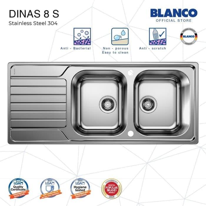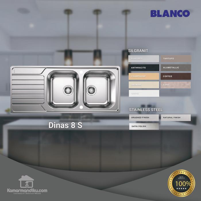 BLANCO Germany merupakan pemimpin pasar di Jerman untuk produk kitchen sink stainless steel. BLANCO sudah memproduksi sink stainless steel selama lebih dari 90 tahun. BLANCO DINAS 8S – Desain sangat modern dan minimalis – Terbuat dari bahan stainless steel 304 dengan kandungan 18/10 (18% Chromium, 10% Nikel) – Satu lubang besar dilengkapi dengan drainer (sayap) untuk mengeringkan peralatan makan – Reversibel: Sayap dapat diinstall di kedua sisi (kanan atau kiri) – Sudah termasuk saringan pembuangan 3 ½‘‘ stainless steel – Ukuran Sink: 1160 x 500 mm – Ukuran Lubang: 340x400mm (lubang utama), 340x400mm (lubang kedua) – Kedalaman lubang : 190mm – Finishing: Stainless Steel Brushed – Paket sudah termasuk afur gantung, tetapi masih membutuhkan selang tambahan untuk menyambungkan pipa afur kearah saluran pembuangan air.