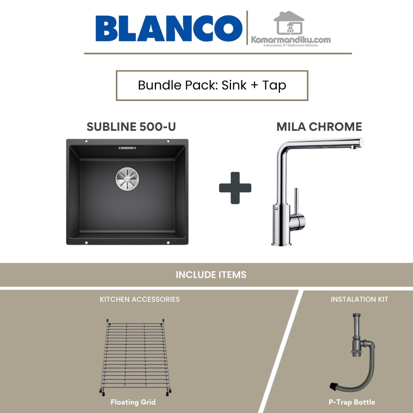 BLANCO SUBLINE 500 -Terbuat dari 80% batu granit dan 20% campuran lainnya seperti teflon dan lainnya. – BLANCO Silgranit sudah menjadi pemimpin pasar selama 30 tahun – Tipe pemasangan: Undermount. – Elegan and higenis, dilengkapi dengan penutup C-overflow – Dilengkapi dengan sistem pembuangan 3 1/2 InFino – Ukuran: 530 x 460 x 190 mm BLANCO MILA Mixer Tap dengan model klasik yang tidak akan ketinggalan jaman Kran air dengan corong yang tinggi, memudahkan proses mencuci Tuas dapat diputar 360 Mendukung air panas dan air dingin Ukuran : Tinggi 270mm 35 mm diameter lubang untuk pemasangan keran Cartridge Keramik Dilengkapi dengan selang flexible dengan panjang 350 mm and konektor 3/8 #39; #39; untuk kemudahan instalasi. Dilengkapi sertifikasi LGA