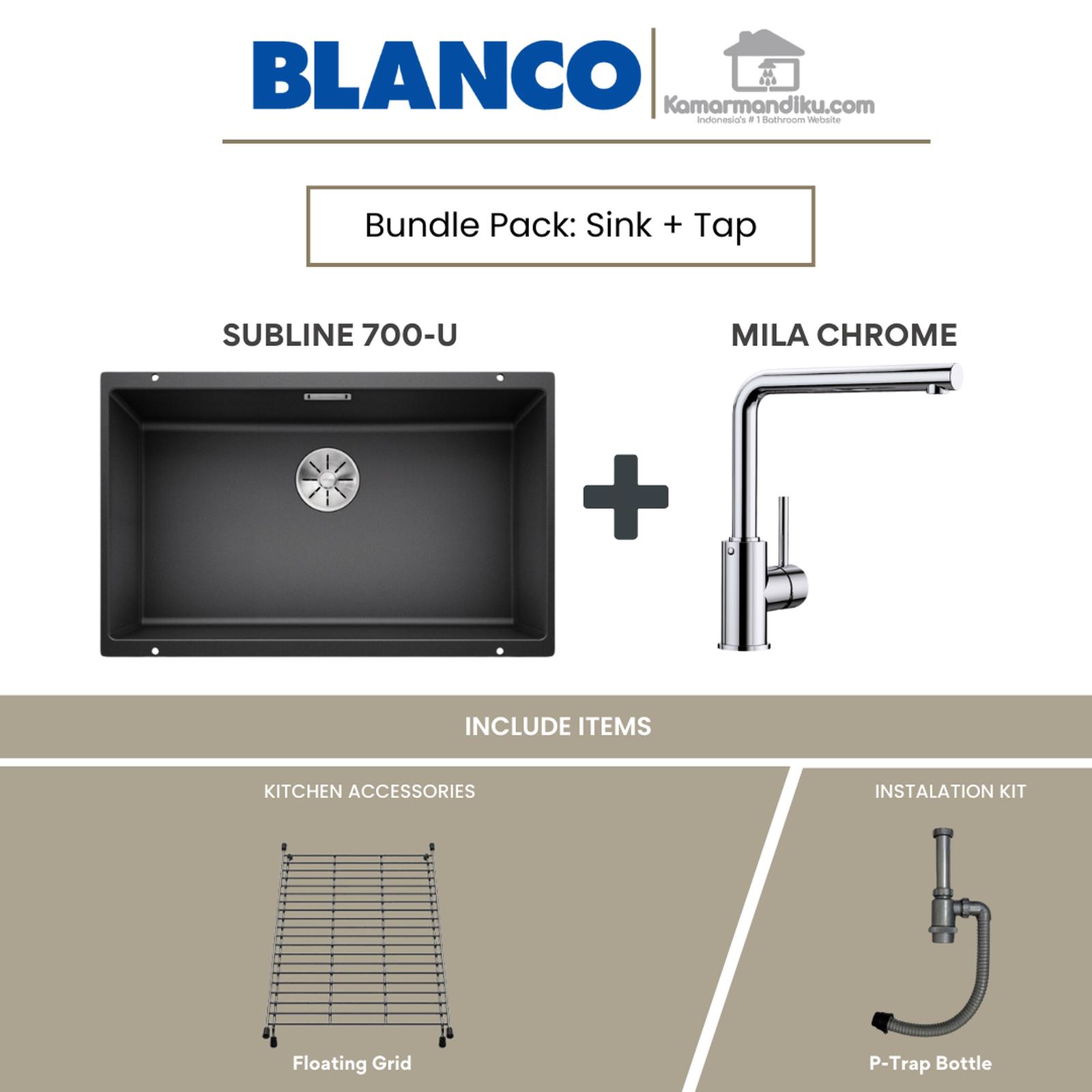 BLANCO SUBLINE 700-U – BLANCO Silgranit terbuat dari 80% batu granit dan 20% campuran lainnya seperti teflon dan lainnya. – BLANCO Silgranit sudah menjadi pemimpin pasar selama 30 tahun – Dirancang dengan desain minimalis dengan ukuran bowl yang besar – Pemasangan: Undermount, dibawah top table. – Elegan amp;higenis, dilengkapi dengan penutup C-overflow – Dilengkapi dengan sistem pembuangan 3 1/2 InFino BLANCO MILA Mixer Tap dengan model klasik yang tidak akan ketinggalan jaman Kran air dengan corong yang tinggi, memudahkan proses mencuci Tuas dapat diputar 360 Mendukung air panas dan air dingin Ukuran : Tinggi 270mm 35 mm diameter lubang untuk pemasangan keran Cartridge Keramik Dilengkapi dengan selang flexible dengan panjang 350 mm and konektor 3/8 #39; #39; untuk kemudahan instalasi. Dilengkapi sertifikasi LGA