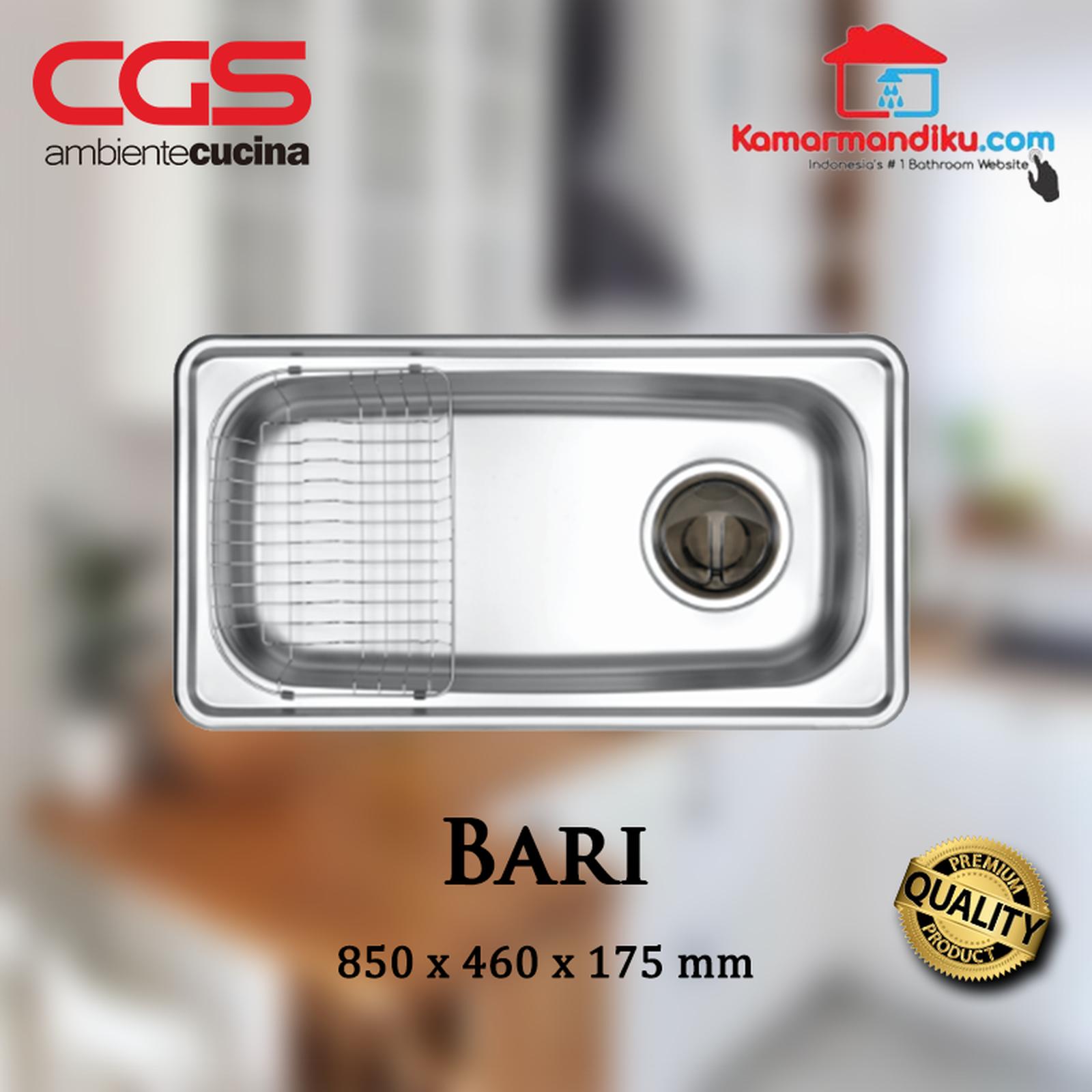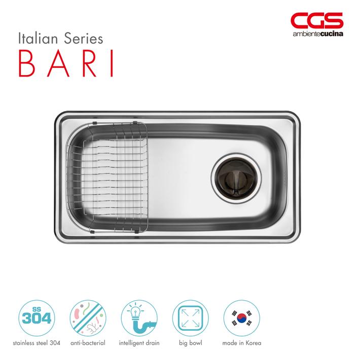 CGS BARI – Terbuat dari bahan stainless steel 304 berkualitas tinggi – kandungan 18% chrome dan 8% nikel Finishing stainless steel brushed – Fitur : 1 lubang cuci piring yang besar dan dalam, cocok untuk mencuci panci dan piring berukuran besar – Dilengkapi dengan aksesoris kitchen sink untuk meningkatkan pengalaman Anda dalam mempersiapkan makanan Ukuran sink: 850 x 460 x 175 mm Ukuran lubang sink : 780 x 390 mm Kedalaman lubang : 17.5 cm