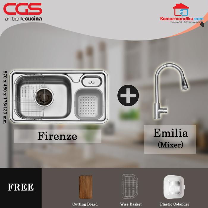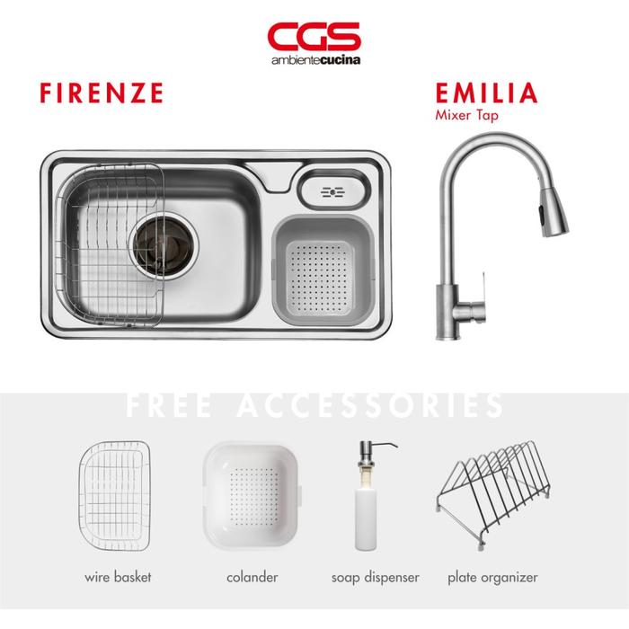 & Free ShippingCGS FIRENZE – Terbuat dari bahan stainless steel 304 berkualitas tinggi – kandungan 18% chrome dan 8% nikel Finishing stainless steel brushed – Fitur : 1 lubang cuci piring yang besar dan dalam dilengkapi lubang tambahan untuk mempersiapkan makanan.