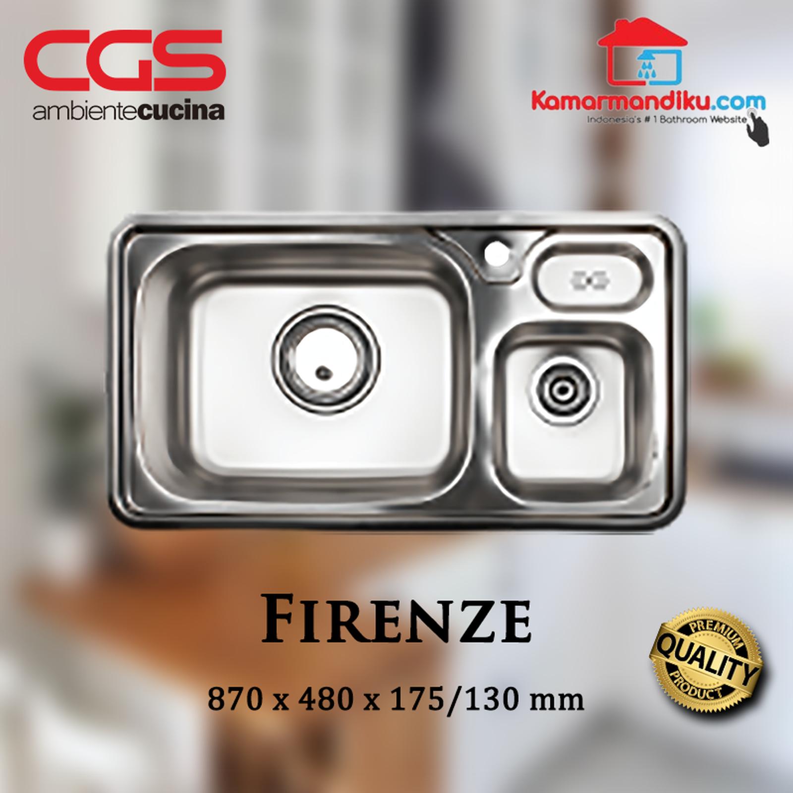 & Free ShippingCGS FIRENZE – Terbuat dari bahan stainless steel 304 berkualitas tinggi – kandungan 18% chrome dan 8% nikel Finishing stainless steel brushed – Fitur : 1 lubang cuci piring yang besar dan dalam dilengkapi lubang tambahan untuk mempersiapkan makanan. – Dilengkapi satu lubang kecil untuk soap dispenser lengkap dengan drain system
