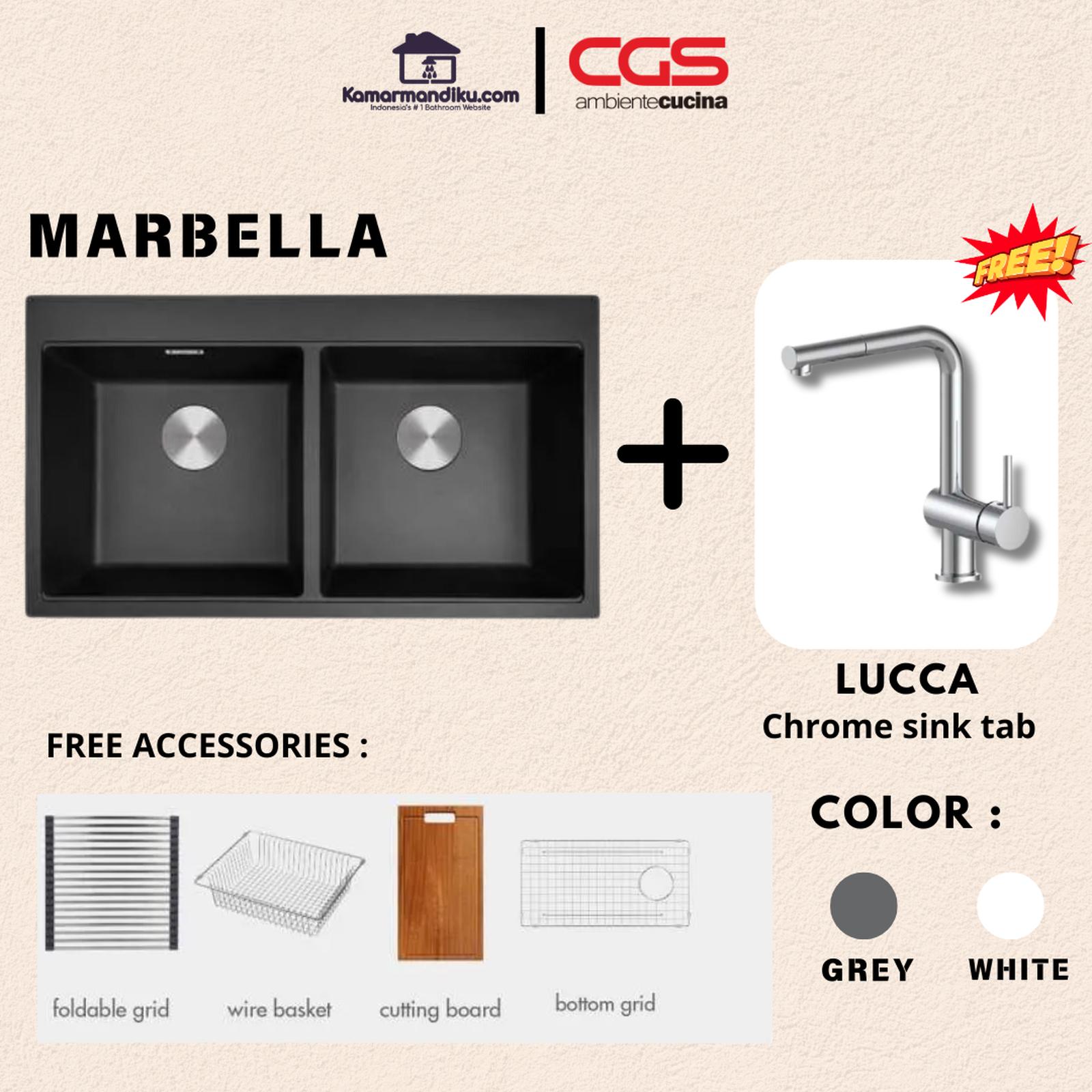 (1) CGS MARBELLA ROCK GRANITE -Material Komposit RockGranite Terbuat dari 80% granit alami -Kuat dan tahan lama, memiliki tampilan dan sensasi sentuhan seperti batu asli -Permukaan sink tidak berpori, higienis, tahan noda amp; anti-bakteri -Perawatan simpel dan mudah dibersihkan, serta tahan terhadap goresan -Dilengkapi dengan intelligent drain waste kit for RockGranite yang berukuran 3,5 inch -Tersedia warna: Black,Grey,White -Tipe Instalasi: Insert -Dimensi Luar Kitchen Sink: 860 x 480 x 205 mm -Dimensi Lubang: 390 x 370/ 390 x 370 mm (2) CGS LUCCA Pull-Out Mixer Taps – Chrome -Kran tipe Pull Out, memudahkan mencapai area yang jauh -Mendukung air panas amp; dingin (mixer tap) -Kran dapat diputar 360 -Ukuran diameter lubang 3,5 cm