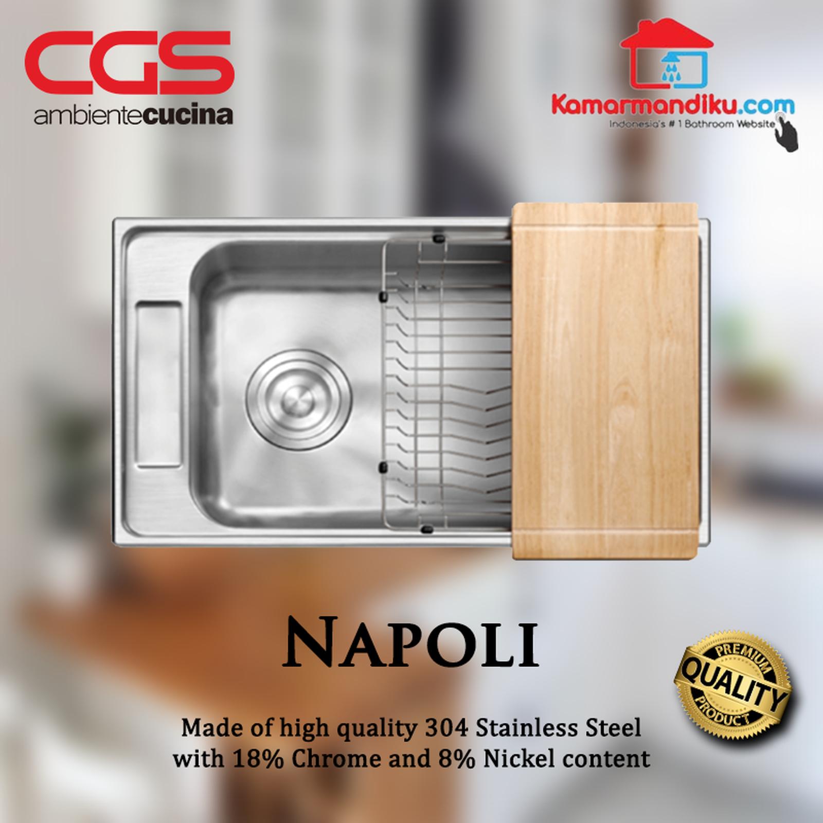 & Free ShippingCGS NAPOLI – Terbuat dari bahan stainless steel 304 berkualitas tinggi – kandungan 18% chrome dan 8% nikel Finishing stainless steel brushed – Fitur : 1 lubang cuci piring yang besar dan dalam, cocok untuk mencuci panci dan piring berukuran besar – Dilengkapi dengan aksesoris kitchen sink untuk meningkatkan pengalaman Anda dalam mempersiapkan makanan Ukuran sink: 760 x 440 x 225 mm Ukuran lubang sink : 630 x 380 mm Kedalaman lubang : 22.5 cm Ketebalan stainless steel : 0.8 mm Free Aksesoris : Wire Basket, Cutting Board Dilengkapi dengan Intelligent Drain System, berukuran 4.6 #34;