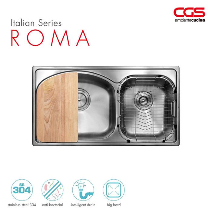& Free ShippingCGS ROMA – Terbuat dari bahan stainless steel 304 berkualitas tinggi – kandungan 18% chrome dan 8% nikel Finishing stainless steel brushed – Fitur : 2 lubang cuci piring yang besar dan dalam, cocok untuk mencuci panci dan piring berukuran besar – Dilengkapi dengan aksesoris kitchen sink untuk meningkatkan pengalaman Anda dalam mempersiapkan makanan Ukuran sink: 825 x 450 x 220/170 mm Ukuran lubang sink pertama : 450 x 375 mm, kedalaman lubang: 220mm Ukuran lubang sink kedua : 275 x 320 mm, kedalaman lubang: 170mm Ketebalan stainless steel : 0.8 mm Dilengkapi dengan Intelligent Drain System Ukuran drain lubang pertama : 4.6 #34; inch Ukuran drain lubang kedua : 3.5 #34; inch Free Aksesoris : Wire Basket, Cutting Board