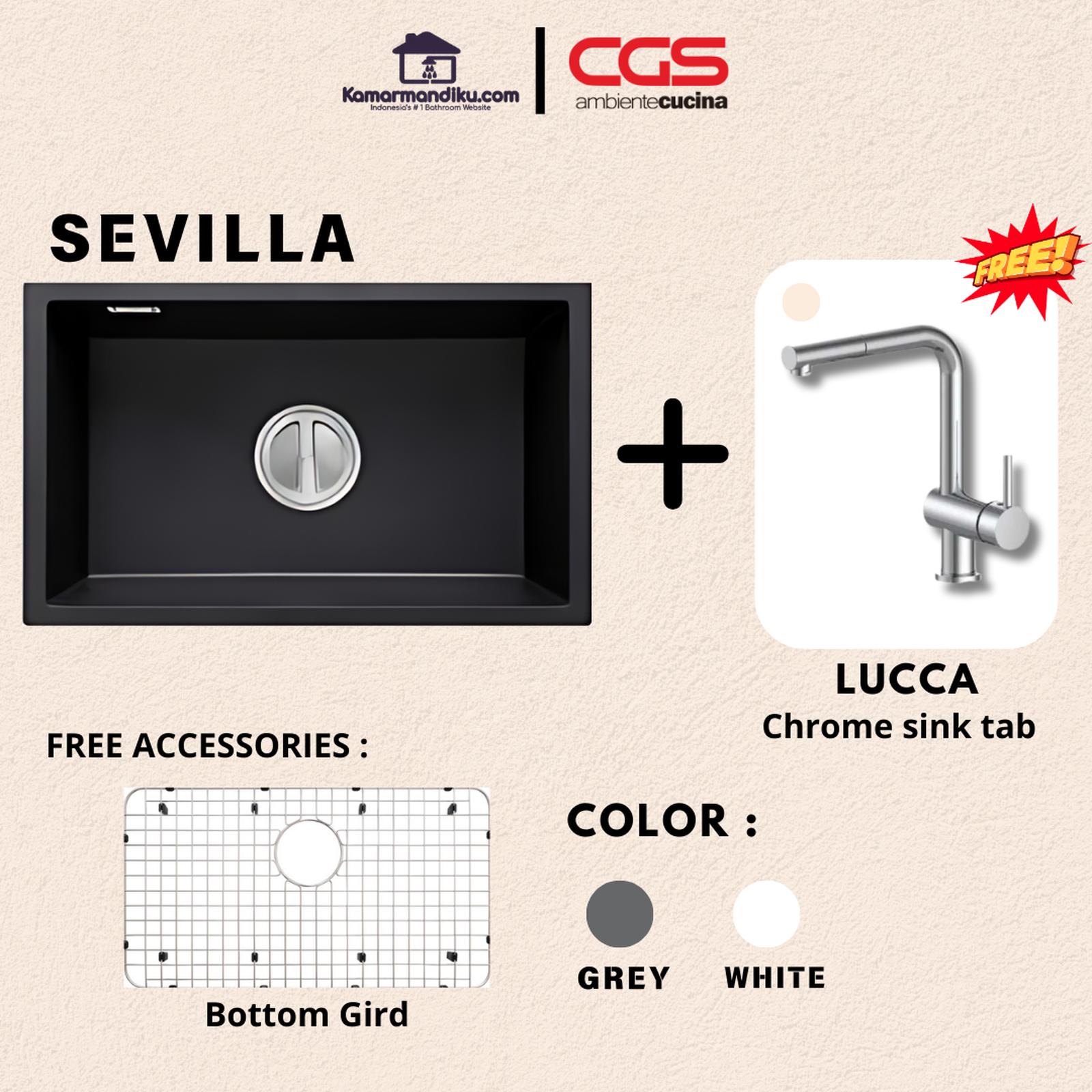 (1) CGS SEVILLA ROCK GRANITE -Material Komposit RockGranite Terbuat dari 80% granit alami -Kuat dan tahan lama, memiliki tampilan dan sensasi sentuhan seperti batu asli -Permukaan sink tidak berpori, higienis, tahan noda dan anti-bakteri -Perawatan simpel dan mudah dibersihkan, serta tahan terhadap goresan -Dilengkapi dengan aksesoris premium Bottom Grid untuk melindungi sink dari benturan peralatan makan dan membantu pengeringan peralatan makan langsung didalam bak cuci piring -Dilengkapi dengan intelligent drain waste kit berukuran 5,4 inch -Tersedia dalam warna: Black, Grey, White -Tipe Instalasi: Insert amp; Undermount -Dimensi Luar Kitchen Sink: 800 x 470 x 210 mm -Dimensi Lubang: 730 x 420 x 210 mm (2) CGS LUCCA Pull-Out Mixer Taps Chrome -Kran air dengan tipe Pull Out, memudahkan mencapai area yang jauh -Mendukung kran air panas amp; dingin (mixer tap) -Kran Air dapat diputar 360 derajat -Handle kran diposisikan di sebelah kanan -Ukuran diameter lubang 3,5 cm