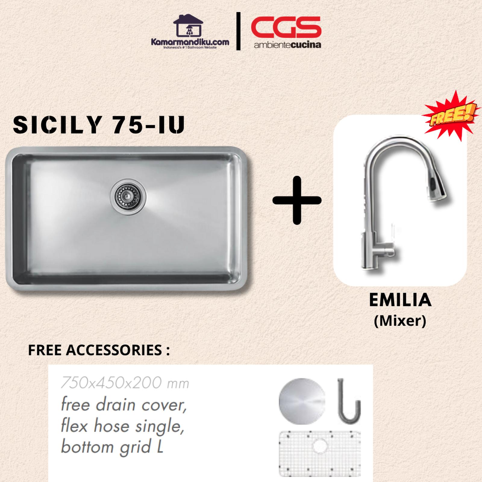 (1) CGS SICILY 75-U – Terbuat dari bahan stainless steel 304 berkualitas tinggi – kandungan 18% chrome dan 8% nikel – Finishing stainless steel brushed – Tipe Pemasangan Sink : Undermount (dibawah top table) – Fitur : 1 lubang besar – Cocok untuk pengunaan pada dapur modern minimalis – Dilengkapi dengan drain sytem 3,5 #34; Ukuran sink: 750 x 450 x 200 mm Kedalaman lubang :20 cm Ketebalan stainless steel : 1 mm (2) CGS EMILIA – Kran Air dengan model minimalis, cocok untuk design dapur modern – Mendukung kran air dingin dan air panas – Dilengkapi dengan shower spray panjang +- 1mtr yang bisa ditarik keluar – SUS 304 – Ukuran diameter lubang 3,5 cm.