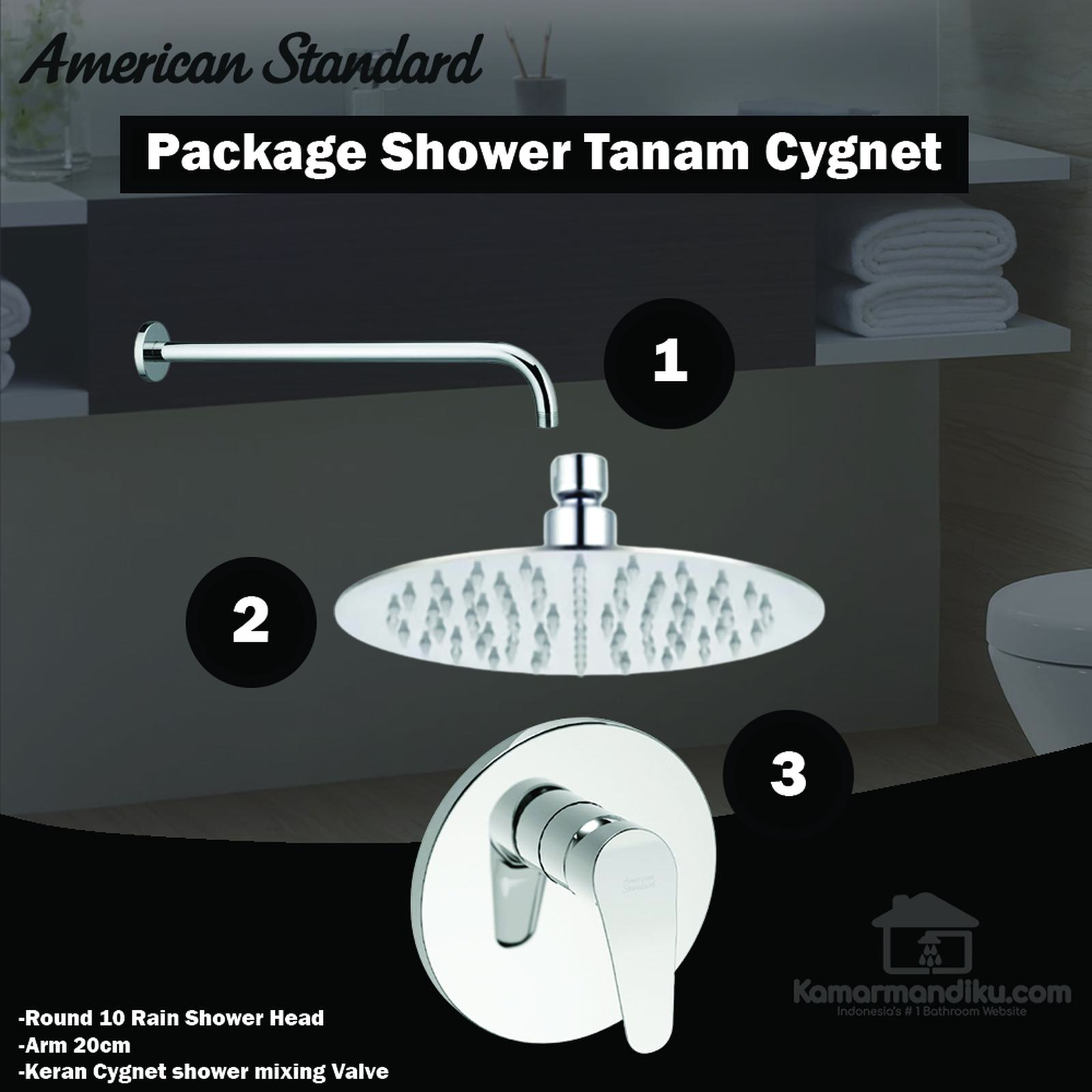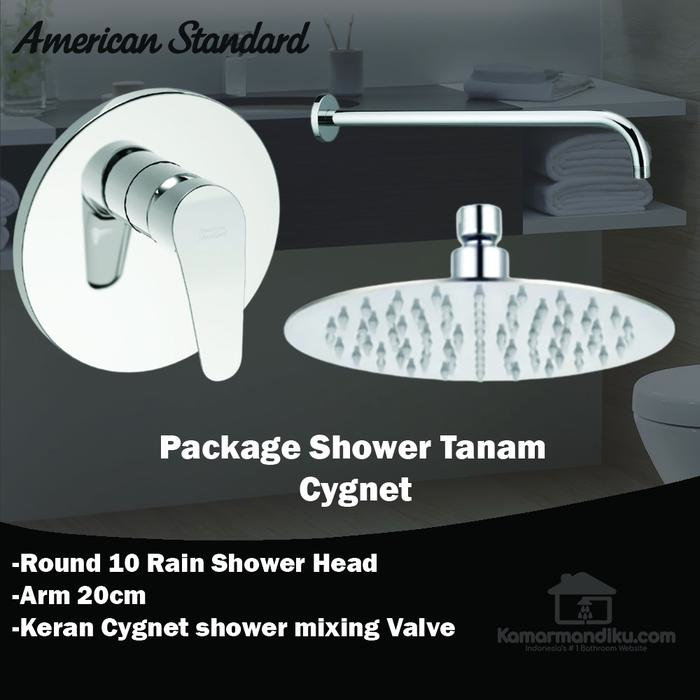 Paket American Standard shower head round 10 #34; Kran cygnet + arm 20cm Yang Didapat: – Shower head 10 inch stainless steel – keran cygnet concealed shower mixing valve – arm 20cm