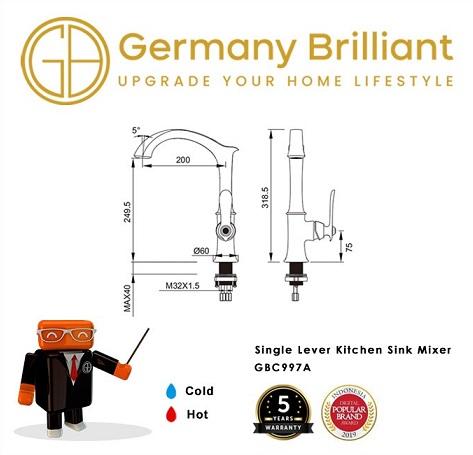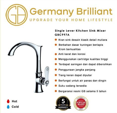 & Free ShippingGermany Brilliant Kran Sink / Keran Cuci Piring Panas Dingin GBC997A – Kran sink dengan desain klasik detail mutiara – Kran sink cocok untuk pemasangan di atas sink/meja – Berbahan dasar Kuningan di lapisi krom berkualitas. – Berfungsi untuk air panas dan dingin – Anti karat amp; korosi – Tiang keran dapat diputar 360 derajat