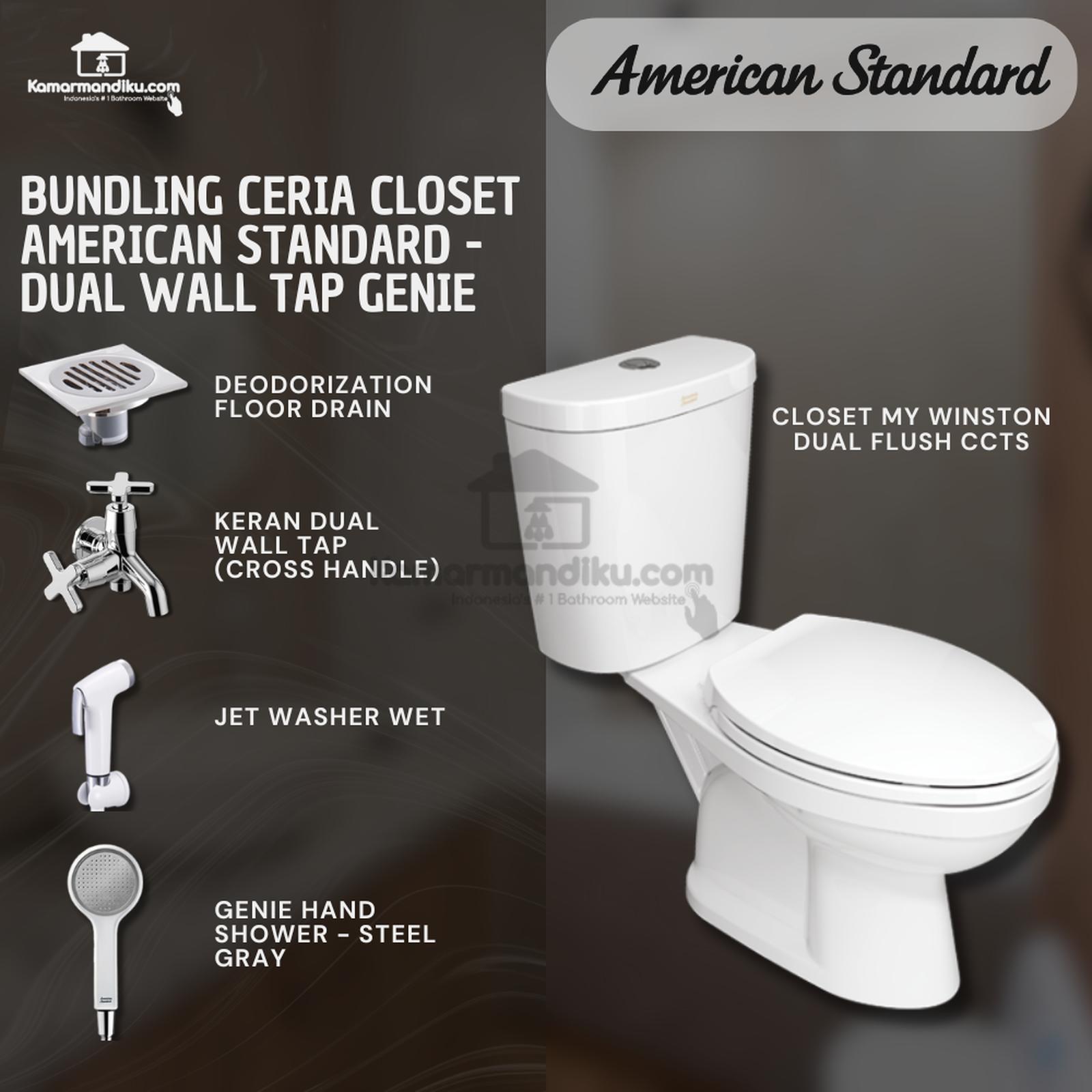 & Free ShippingPaket CERIA-American Standard Kloset my Winston – Dual Tap Genie Yang terdapat di dalam paket : 1. American Standard Kloset My winston CCST dual flush 2.. American Standard Keran my winston dual wall tap cross 3. American Standard Genie hand shower steel grey 4. American Standard TP 404 Jet washer White 5. American Standard Floor Drain deodorization 10 x 10cm Mohon Chat terlebih dahulu untuk ketersediaan Stok . Terimakasih .