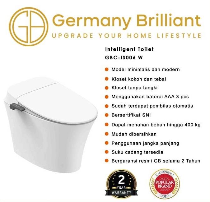 CLOSET duduk Germany Brilliant GBCIS006-W KODE: GBCIS006-W – Germany Brilliant menghadirkan closet bersertifikat SNI. – Model minimalis dan modern – Kloset kokoh dan tebal – Kloset tanpa tangki – Menggunakan baterai AAA 3pcs – Sudah terdapat pembilas otomatis – Dapat menahan beban hingga 400kg – Mudah dibersihkan – Penggunaan jangka panjang – Suku cadang tersedia – Bergaransi resmi GB selama 10 Tahun – Jarak AS = 30cm