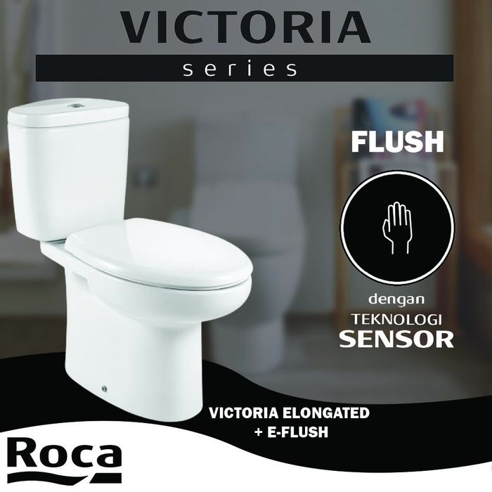 PROMO Roca closet VICTORIA ELONGATED + E-FLUSH sensor Soft Closing Close-coupled WC S-Trap outlet 500 mm UF Resin Seat amp; Cover with soft close Electronic flush with adjustable dual flush and no electrical installation CUKUP DENGAN MELAMBAIKAN TANGAN DI ATAS SENSOR