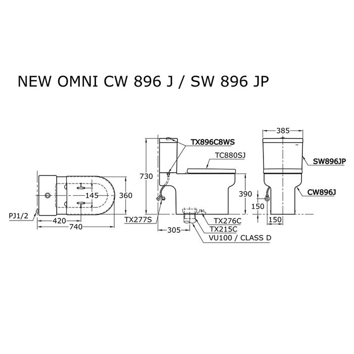 Closet Duduk CW896J / SW896JP 4.5 / 3 L Dual Flush Solid Duroplast Seat Cover Bowl Shape: European Std. Specifications Rough-in: 305 mm Bowl Shape: European KEUNGGULAN Rapid Flushing Dual Flush