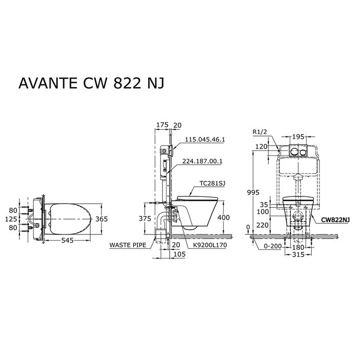 & Free ShippingTOTO Closet Duduk CW822NJ Wall Hung 4.5 / 3 L Dual Flush Solid Duroplast Seat Cover SPECIFICATIONS Rough-in: 220 mm Bowl Shape: Elongated KEUNGGULAN Rapid Flushing Dual Flush