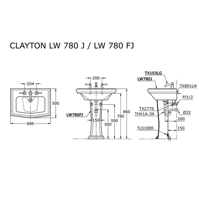 TOTO Wastafel LW780J/LW780FJ Specifications Width: 686 mm Depth: 500 mm